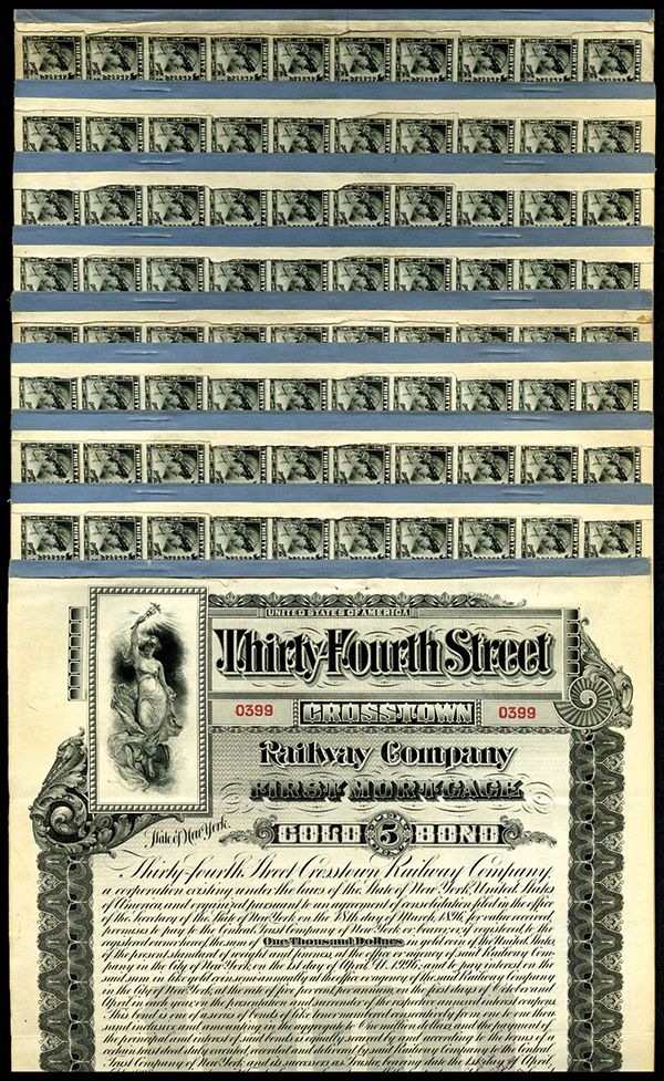 Thirty-Fourth Street Cross-Town Railway Bonds, Lot of Nine. 1896. NY. First Mortgage. Black border and underprint. Lovely allegorical lady holding a caduceus. IBN. XF. Most are very crisp, bright and attractive. (9)
