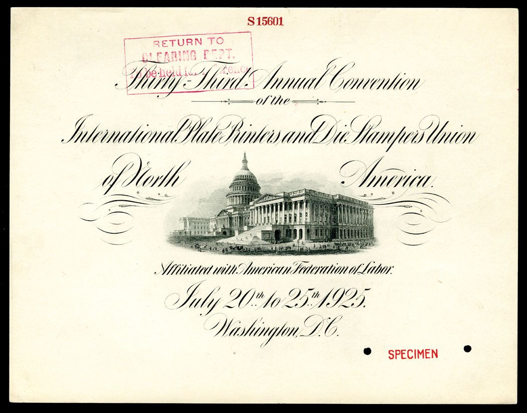 New York, 1925, Inner front page Specimen printed by ABNC with dramatic image of the U.S. Capital, XF condition. Rare Convention booklet Specimen ABNC plate.