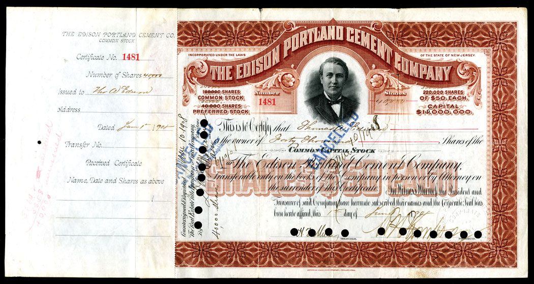 New Jersey, 1908, I/C, #1481, 40,000 Shares (1/6th of the capitalization in 1908), Black on brown border and underprint, Portrait of Edison top center under arched title, Fine condition with POC's, FLBNC. ITASB Thomas A. Edison on back of certificate. Attractive and popular Edison autograph from this well known inventor. ABNC.