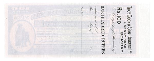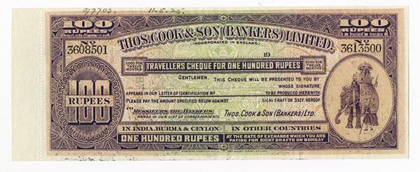 India, Burma & Ceylon. Traveler's Cheque for 100 Rupees, intended for use in India, Burma & Ceylon, s/n 3608501 but CANCELLED perforated, vignette of men riding elephant at right, printer's annotations in top margin, XF, BWC.
