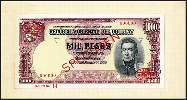 Thomas De La Rue Sample Book from 1958 For Venezuelan Client With Specimen Notes. England and Venezuela. Included is the Leather bound Sample book with 4 tipped in specimen banknotes, with original correspondence listing the contents. Includes the following specimens; Bolivia, 1945, 10 Bolivianos, P-141s; Brazil, ND, 10 Cruzeiros, P-159c; Peru, 1957, 500 Soles, P-80s; and, Uruguay, 1939, 1000 Pesos, P-41bs, all are mounted on the right back margin to the book and would grade between Choice AU to CU. The book originally contained 17 specimen banknotes by TDLR. Also included are 2 different TDLR pieces of correspondence, including a letter written entirely in Spanish as well as an inventory list of the contents of the book. Rare and interesting TDLR sample book.
