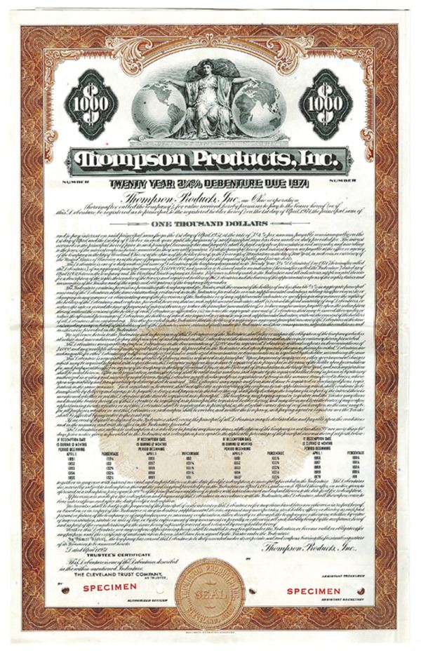 Ohio. $1000 Specimen 3 1/4% Debenture Coupon Bond, Black print on brown border and under tint, Allegorical woman at top between two globes, Specimen overprints and POC's, VF-XF condition, SBNC.
