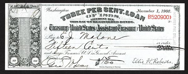 Washington, D.C., November 1, 1902, 15 cents, Issued and uncancelled, Black on light green undertint, Facsimile signature of Ellis H. Roberts, AU, Rare check, BEP.