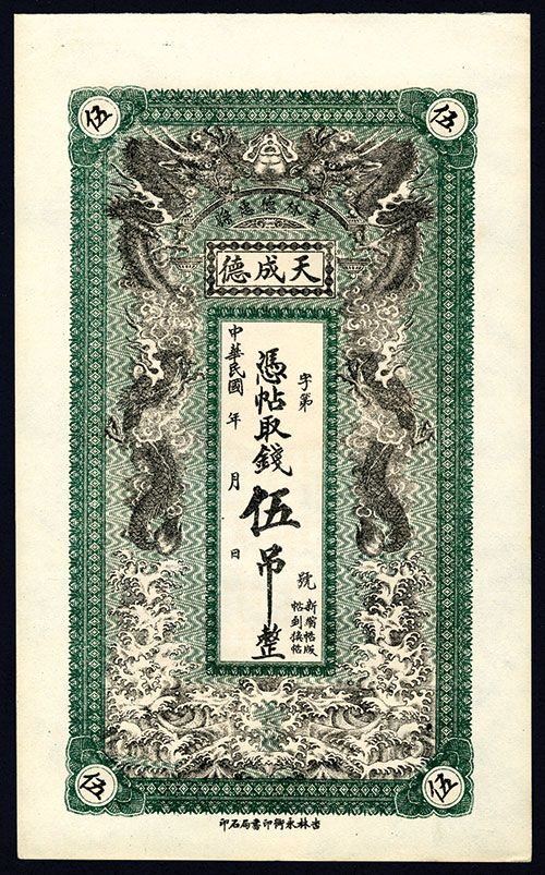 Face value 5 String (Copper); Private printed cash certificate from Jilin province “Tak Wai Hsien”; company name “Tian Tsing Tak”, from republic era, no year nor date; Printed conditions on reverse. Black facing dragons and text on blue-green border, back orange, Uncirculated condition, attractive and scarce private banknote.