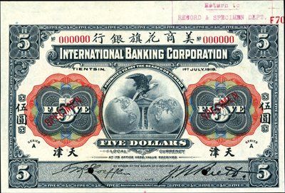 1918. P-S430 Unlisted. $5 Specimen. Choice Unc. Red specimen overprint, POC and "000000" serial numbers. Unlisted as a specimen. ABNC.