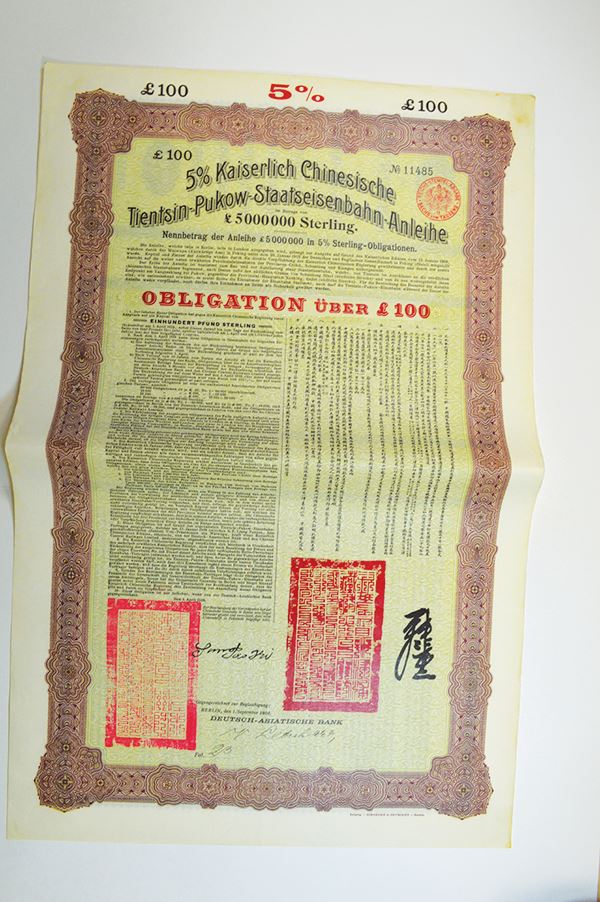 Issued by the Deutsch-Asiatische Bank for 100 Pounds. German and Chinese text. No coupons. 1 piece.