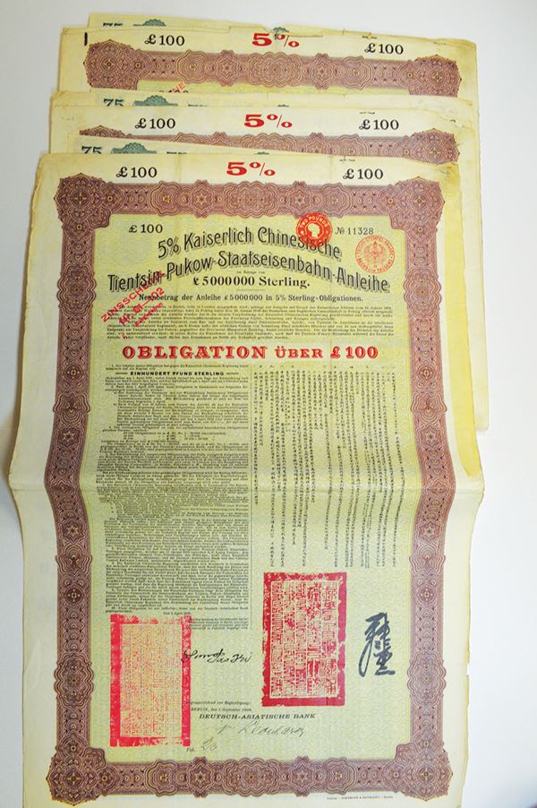 Issued by the Deutsch-Asiatische Bank for 100 Pounds. German and Chinese text. With coupons. 3 pieces.