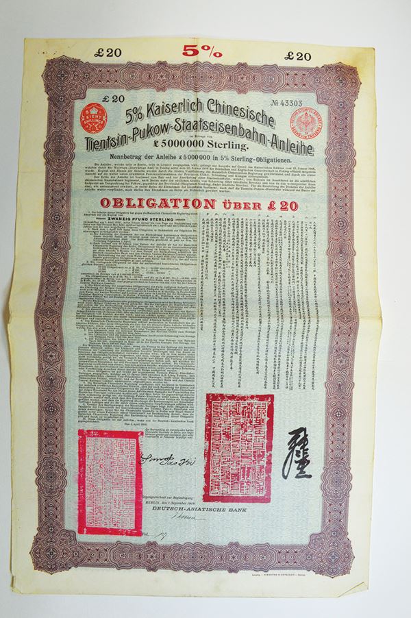 Issued by the Deutsch-Asiatische Bank for 20 Pounds. German and Chinese text. No coupons. 1 piece.