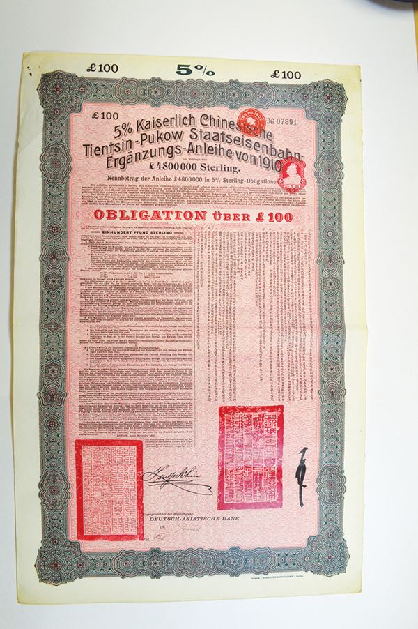 Issued by the Deutsch-Asiatische Bank for 100 Pounds. German and Chinese text. Coupons attached. 1 piece.