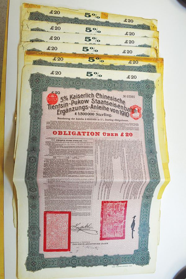 Issued by the Deutsch-Asiatische Bank for 20 Pounds. German and Chinese text. Coupons attached. 6 pieces.