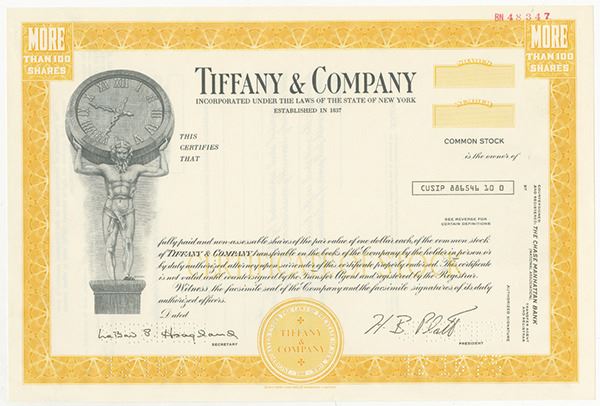 New York, 1975. >100 Shares Specimen Stock Certificate, Black text with orange border and underprint, Allegorical man holding a clock at left. Specimen POCs, VF condition, SCBN. Tiffany & Co. is an American luxury jewelry and specialty retailer headquartered in New York City. It sells jewelry, sterling silver, china, crystal, stationery, fragrances, water bottles, watches, personal accessories, and leather goods.