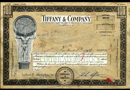 New York, NY. January 17 to January 30, 1969. 100 Shares, Unique model or mock up, predigital design of the Tiffany and Company stock certificate printed by Security-Columbian BNC, title and text pasted onto photo-proof of border and seal. Plate numbers of each design element printed in red, Facsimile signatures of Farnham Lefferts as president and Hoagland as Secretary. Glue stains and scuffing from archival use, but unique and historic certificate. SCBNC.