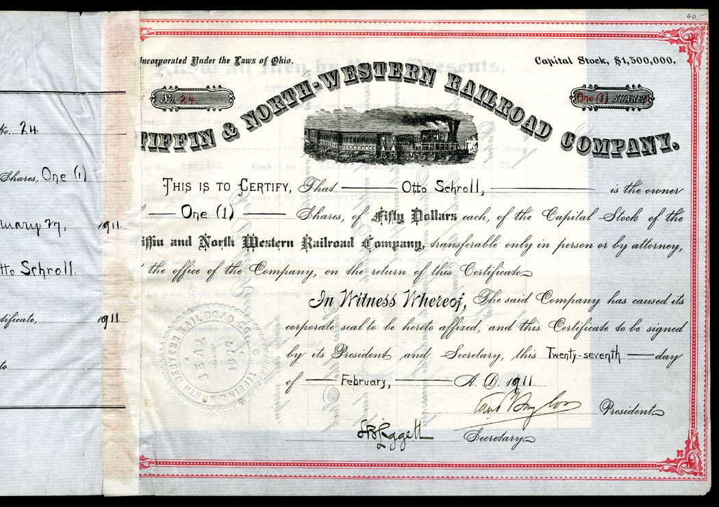 Ohio, 1911, Tiffin & North-Western Railroad Co., Certificate #24, One Share of Issued Stock, VF Condition.