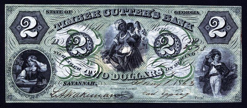 Timber Cutter's Bank Obsolete Banknote.Savannah, Georgia, 1863, $2, GA-335-G4b, Issued banknote, Black on green underprint, young woman on lower left, sailor on lower right and slave mother and child in middle, Choice XF to AU condition. BCC. Attractive and popular note.
