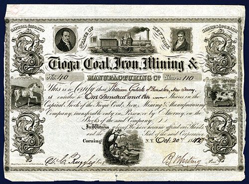 New York, 1842, 100 Shares, Issued Stock, Black print with ornate borders, Vignette of very early locomotive top center flanked by portraits of notable gentlemen, VF condition, DTLC.