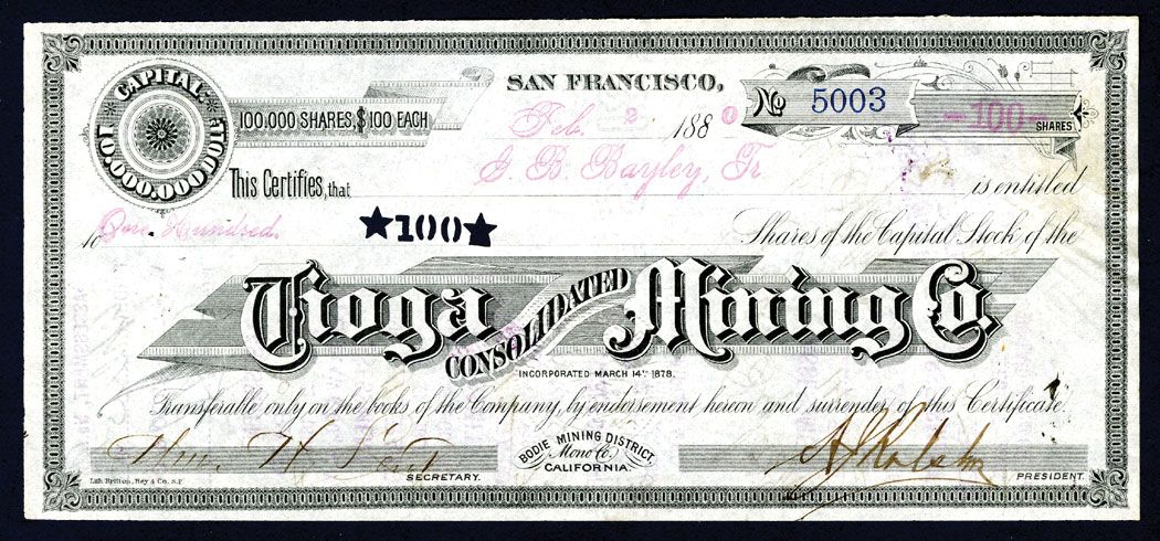 California, 1880, I/U Stock, 100 Shares, #5003, Black print with ornate border and underprint, No Vignette, VF condition, Britton, Rey & Co. Lith. Mine location is Bodie Mining District, California.