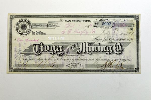 California, 1880, I/U Stock, 100 Shares, Black print with ornate border and underprint, No Vignette, VF condition, Britton, Rey & Co. Lith. Mine location is Bodie Mining District, California.