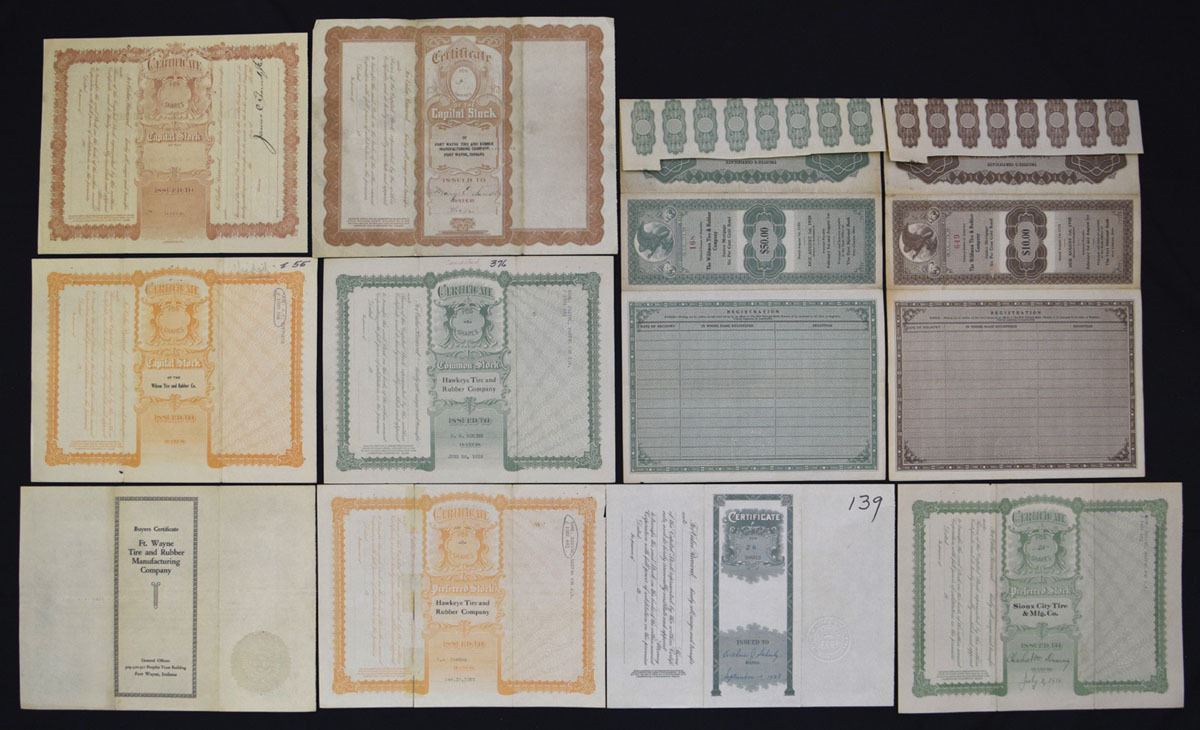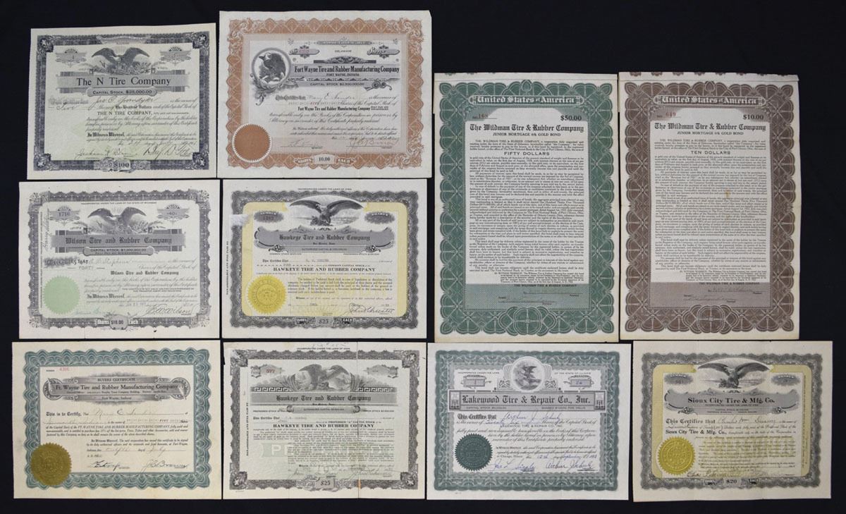 Various States, 1919-55. Lot of 10 Issued and I/C certificates, Includes: The N Tire Co.; Fort Wayne Tire and Rubber Manufacturing Co. (2); Whitman Tire & Rubber Co. (3); Hawkeye Tire and Rubber Co. (2); Lakewood Tire & Repair Co. Inc.; Sioux City Tire & Mfg. Co. Mix of stock certificates and bonds with various capital stock denominations and formats. Conditions range from VF to AU, with typical folds, stamps, and cancellation holes on some pieces. (10). Sold ‘AS IS’ no returns accepted.