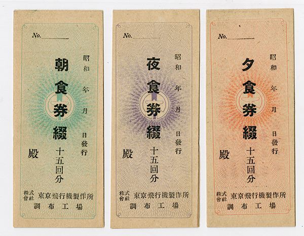 Japan. ND, ca.1920-30's. Lot of meal coupons from Tokyo Aircraft Co. in Showa Era, including breakfast, lunch and dinner, 5 pieces each. Each coupon is good for 15 meals. _________________15__