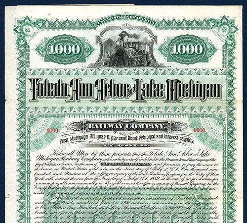 Michigan, 1888, $1000, 1st Mortgage 30 year 6% Specimen Bond, Vertical format, Locomotive at station top center, POC's, VF condition, ABNC. Listed railroad and bond in Cox.
