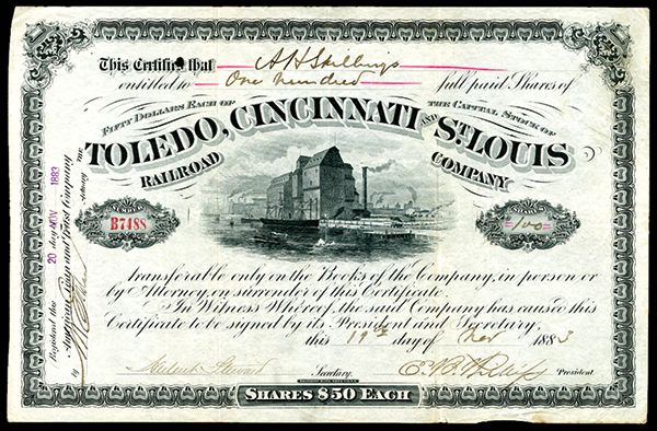 Toledo, Cincinnati and St. Louis Railroad Company Ohio. 1883. 100 Shares, #B7488, Black, steamboat and factory Scene, Issued and uncancelled. Fine condition. Scarce certificate. FBNC.