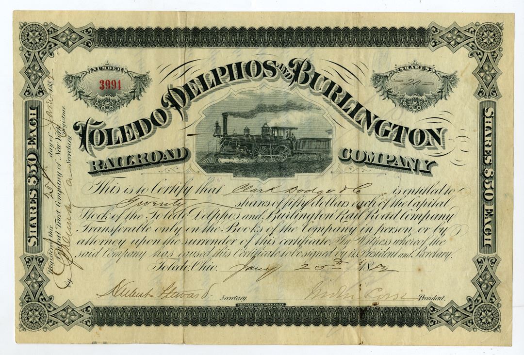 Toledo, Ohio, 1883. 20 Shares Capital Stock I/U Certificate, Black on black border with locomotive in profile at top, Fine-VF condition with toning and minor splitting at fold lines, FBNC. Toledo Delphos and Burlington Railroad Co. was a narrow gauge railroad that was opened on July 4th, 1875 but was merged with the Toledo, Cincinnati and St. Louis Railroad in 1882.