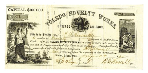 Ohio, 1862, 20 Shares, I/U Stock Certificate, Vignette of man working on metal object on right and Lady Liberty holding shield in front of factory to the left with a variety of their products in the middle under curved title, S/N 182, VF-XF condition.