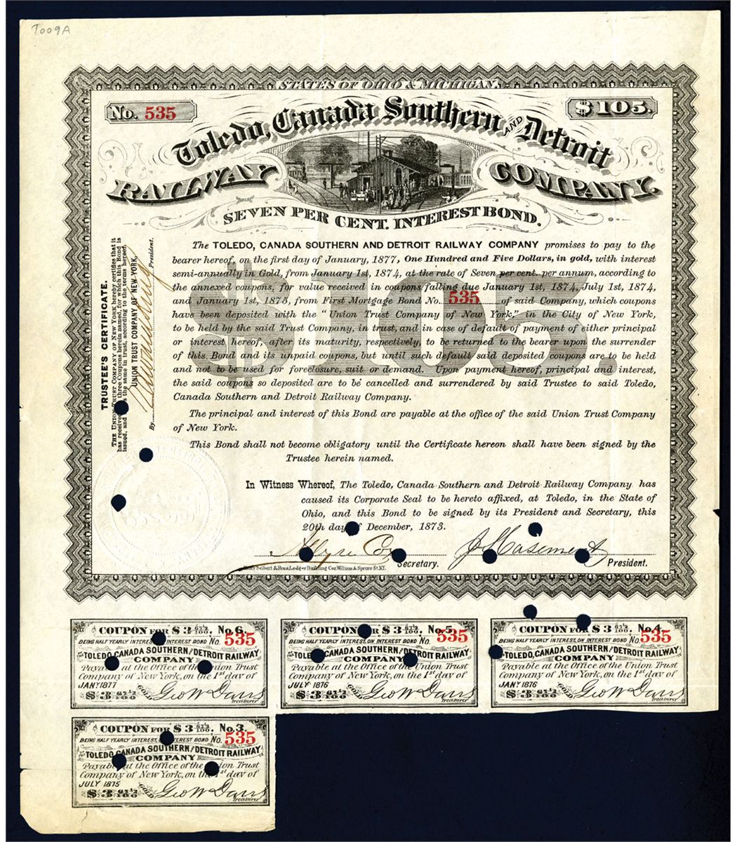 Toledo, OH, 1873, Toledo, Canada Southern & Detroit, Railway Co., Cert # 535, Bond Signed as President by: Former Civil War Union General John S. "General Jack", Casement. Casement, Served as a Brigadier General and lead the 103rd Ohio Volunteers Infantry during the Civil War. After the war, he directed the Union Pacific Railway during the construction of the Transcontinental Railroad. Issued Cancelled. $105 Dollar Bond,VF, Punch Cancelled.