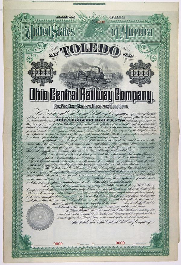 Ohio. 1894, $1000 Specimen 5% General Mortgage Gold Coupon Bond. Black text with green border and undertint, Scene of a train passing by trolly car at top, Red "0000" serial numbers and POC's. Fine-VF condition with toning along margins. Rare specimen in Cox.