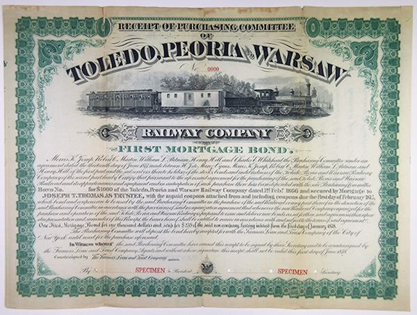 Ohio. 1878, $1000 Specimen First Mortgage Bond, Receipt of Purchasing Committee, Black text with green border and no undertint, large 9.5 inch vignette of early passenger Train at top with passenger car moving on tracks, Red Specimen overprints, "0000" serial number, POC's. VG to Fine condition with stains along top margin, splitting and toning along vertical splits that have been repaired, ABNC. Unlisted color and denomination in Cox, Very Rare.