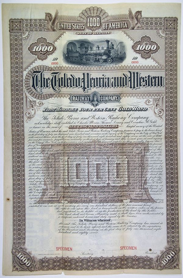 Illinois. $1000 Specimen 4% First Mortgage Gold Coupon Bond, Black text with brown border and undertint, Scene of a train passing from left to right above company name. Red specimen overprints, "0000" serial numbers and POC's, VF condition with small stain at left margin, ABNC. Not known as a specimen in Cox. This was the only example found.