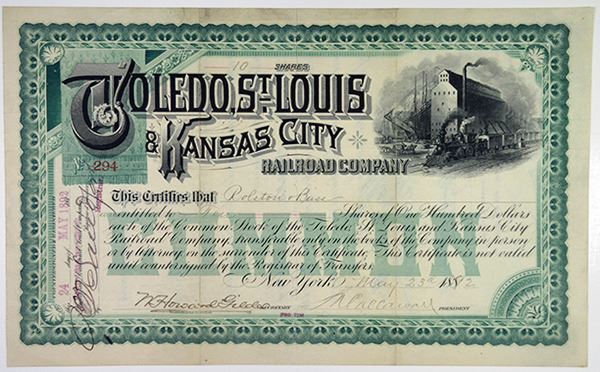 Ohio. 10 Shares I/U Stock Certificate, #294, Black text with green border and underprint with an illustration of a train passing by a large shipping port at top right corner. Fine condition, with discoloration along fold lines, FBNC.
