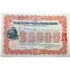 Indiana. $5,000 Registered 3 12% Specimen Prior Lien Gold Bond, Black print on ornate red/orange border and under tint on horizontal format, Company title at top with oncoming locomotive at left of certificate, Specimen overprints and POC's, VF-XF condition, FLBNC. Listed on Cox but unknown as a specimen.