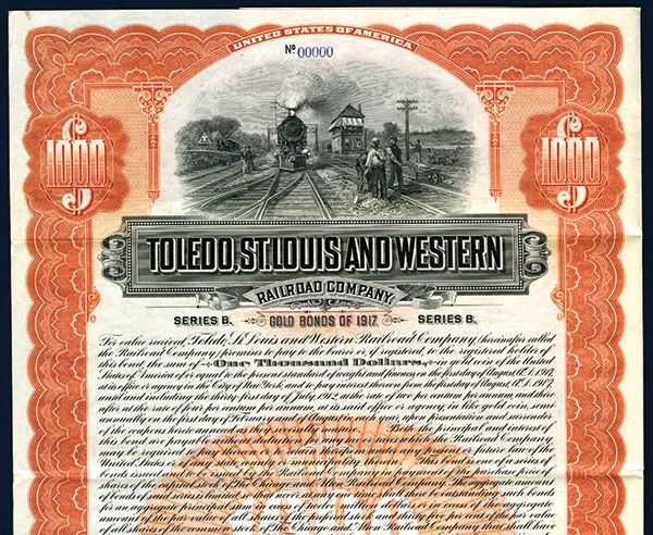 Indiana. 1907. $1000 2% Specimen Bond. Black print with orange border and underprint. Locomotive approaching with workers on right. POC's and red SPECIMEN overprints. VF-XF condition. ABNC. Listed railroad and bond in Cox.