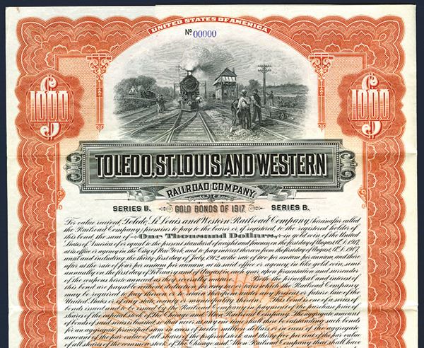 Indiana. 1907. $1000 2% Specimen Bond. Black print with orange border and underprint. Locomotive approaching with workers on right. POC's and red SPECIMEN overprints. VF-XF condition. ABNC. Listed railroad and bond in Cox.