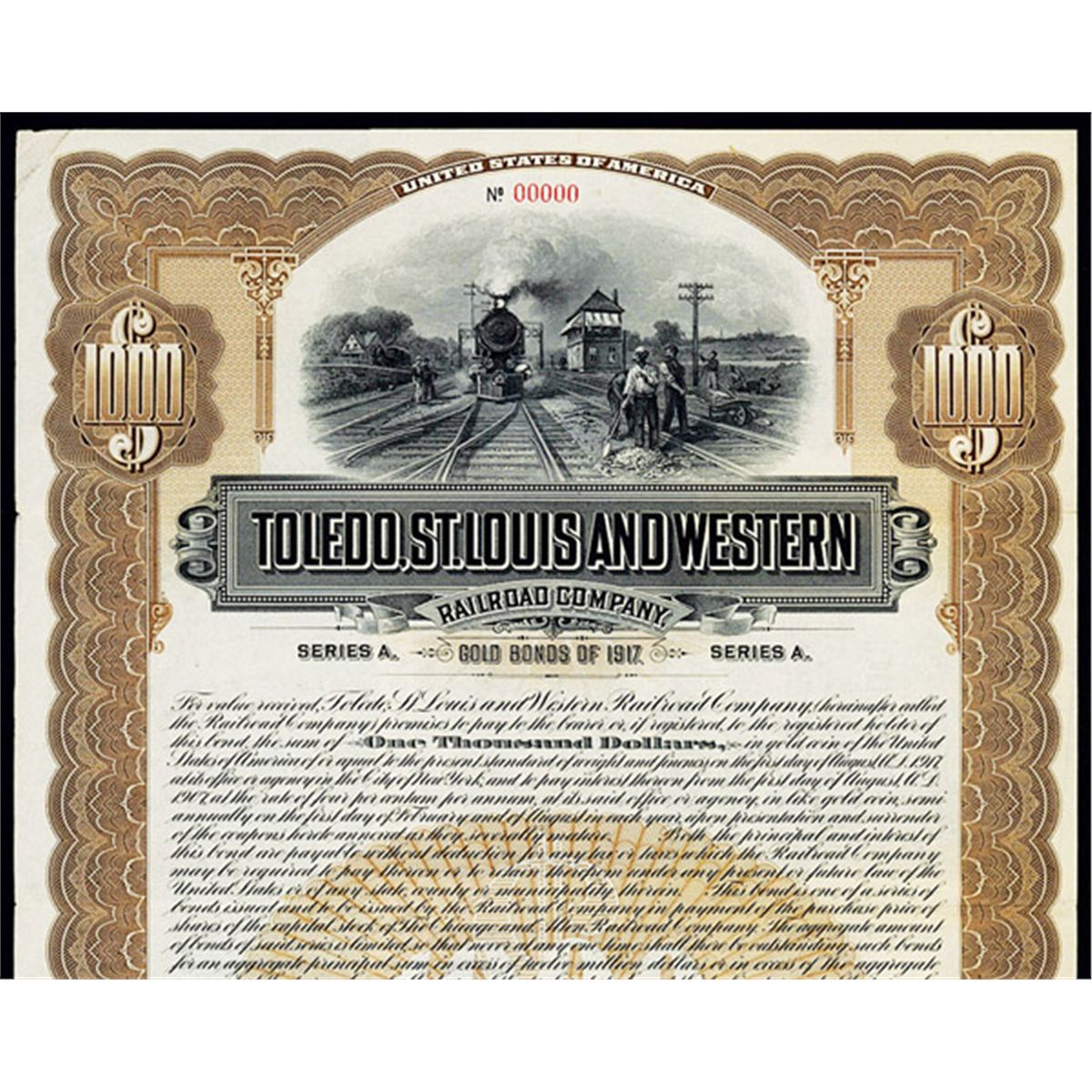 Indiana, 1907, $1000, Series A, 4 % Gold Bond of 1917. Specimen, Black with brown border and underprint. Track workers on right with locomotive straight on approaching, Coupons attached. Red specimen overprints, POC's and “00000” serial numbers. XF condition. Rare and attractive railroad bond. ABNC.