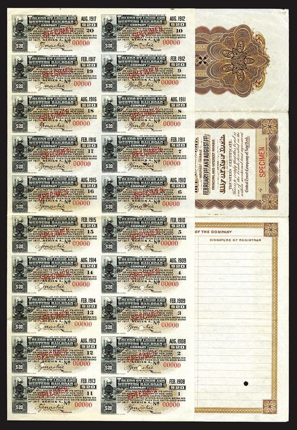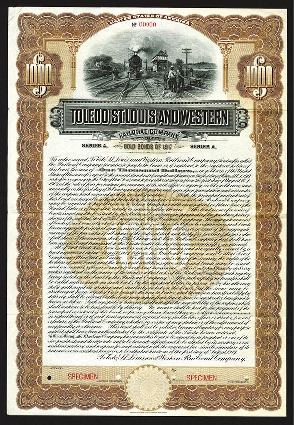 Indiana, 1907, $1000, Series A, 4 % Gold Bond of 1917. Specimen, Black with brown border and underprint. Track workers on right with locomotive straight on approaching, Coupons attached. Red specimen overprints, POC's and "00000" serial numbers. XF condition. Rare and attractive railroad bond. ABNC.