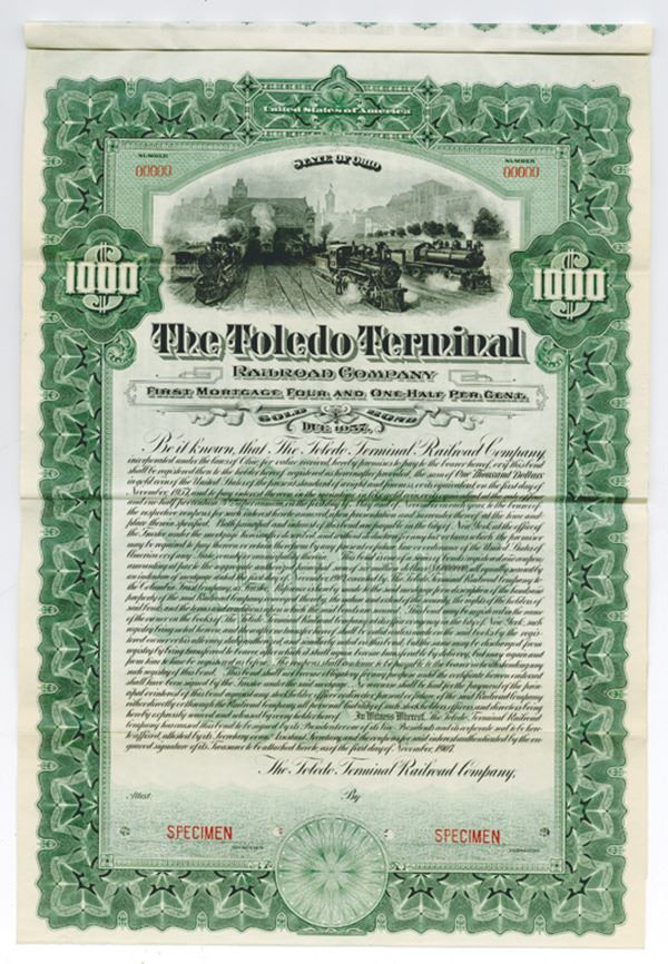 Ohio. 1907 $1000 Specimen First Mortgage Four and One-Half Per Cent Gold Bond Due 1957, green, multiple trains in city. with coupons attached, Uncirculated, POC's, folded in thirds as made. Western BNC.