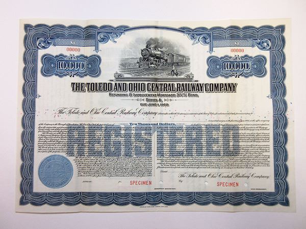 Ohio. $10,000 Registered 3 3/4% Specimen Series A Refunding & Improvement Mortgage Bond, Black print on blue border and under tint on horizontal format, Locomotive passing men resting beside tracks, Specimen overprints and POC's, VF-XF condition, ABNC.