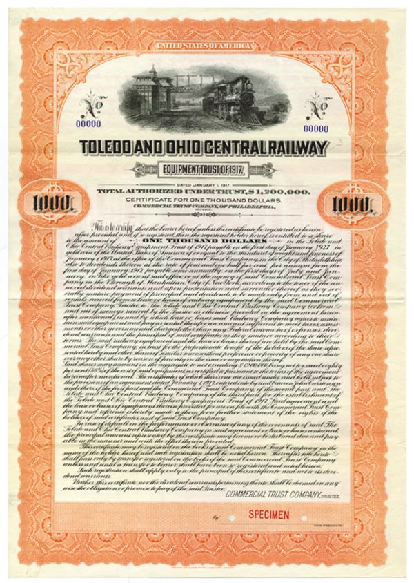 Ohio. $1,000 Specimen 4 1/2% Coupon Bond, Black print on orange border and under tint, Locomotive passing under signal bridge at top, Specimen overprints and POC's, VF-XF condition, ABNC. This is the only bond type known for this railroad.