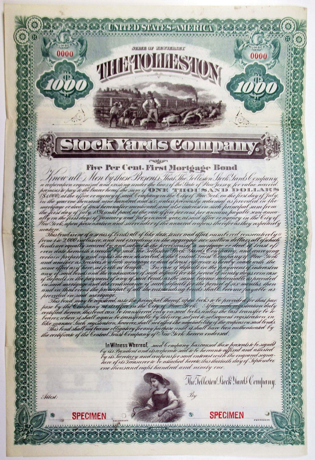 Tolleston, IN. (Inc. in New Jersey), 1891. $1000 Specimen 5% First Mortgage Coupon Bond, Black text with green border and undertint, Men with pigs near passing train at top center. Red specimen overprints, 0000 serial numbers, and POCs. VF condition, ABNC.