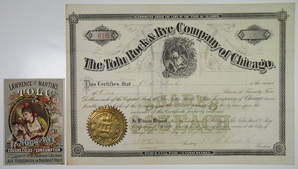 Illinois, 1881. 1 Share I/U Capital Stock Certificate, Black text with black border and brown underprint, Figure at top of a woman with a bottle and glass. Lot also includes 3 x 4.5 inch advertisement card for the Balsam of Tolu by the Tolu Rock & Rye Company of Chicago, which features the same illustration only colorized. Both items are in VF condition. Tolu Rock and Rye was a mid- to late-18th century patent "medicine" intended to cure a wide array of ailments, and was distributed in Chicago by Lawrence & Martin.