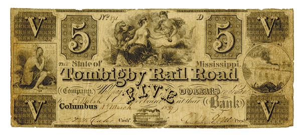 Columbus, Mississippi. 1837, $5, MS-60-G8, Train at right, Native American at left, allegorical figures at top, VG condition. RWH&E.