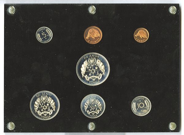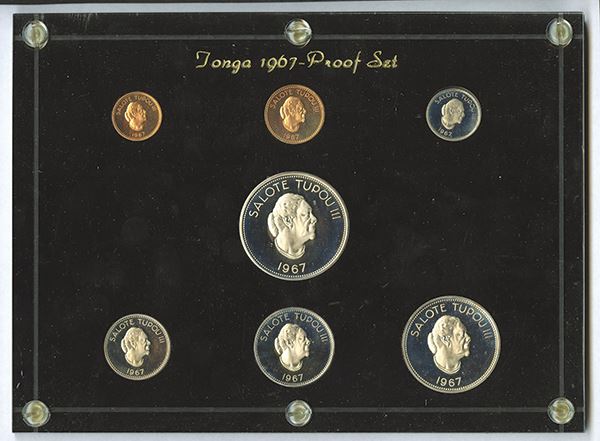 Tonga Proof set, 1967. KM PS3. Includes 1, 2, 5, 10, 20, 50 Seniti and Pa'anga. Nice proof surfaces on all but for the 10 and 20 which exhibit some fogging or small fingerprint. In Capital Plastic holder.