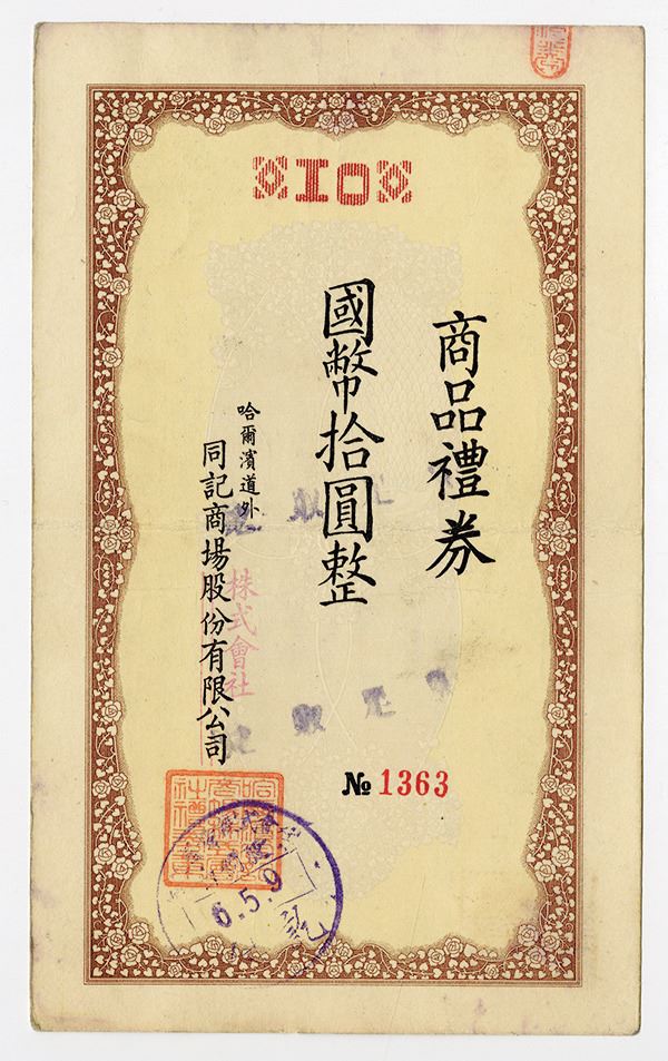 Harbin, China (Under Japanese Occupation), 10 Yuan, Issued and stamped, black printing with brown border and red seals and denomination, back with area to write in amounts spent, a 5 Fen tax stamp is on the back. 5 x 8 inches, S/N 1363, VF condition, possibly used as a circulating bond. Rare Fiscal document during an extremely turbulent pre-Word War II time period.