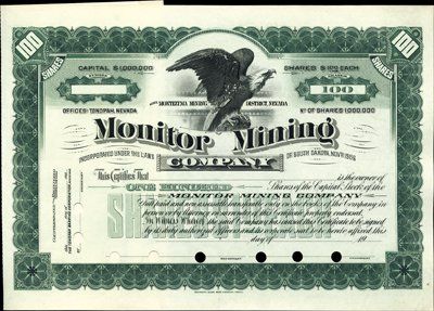 19--, ca.1906. Odd Shares. Specimen stock certificate. POC's. Vignette of eagle. "Mines, Montezuma Mining District, Nevada". Choice uncirculated condition. SBNC.