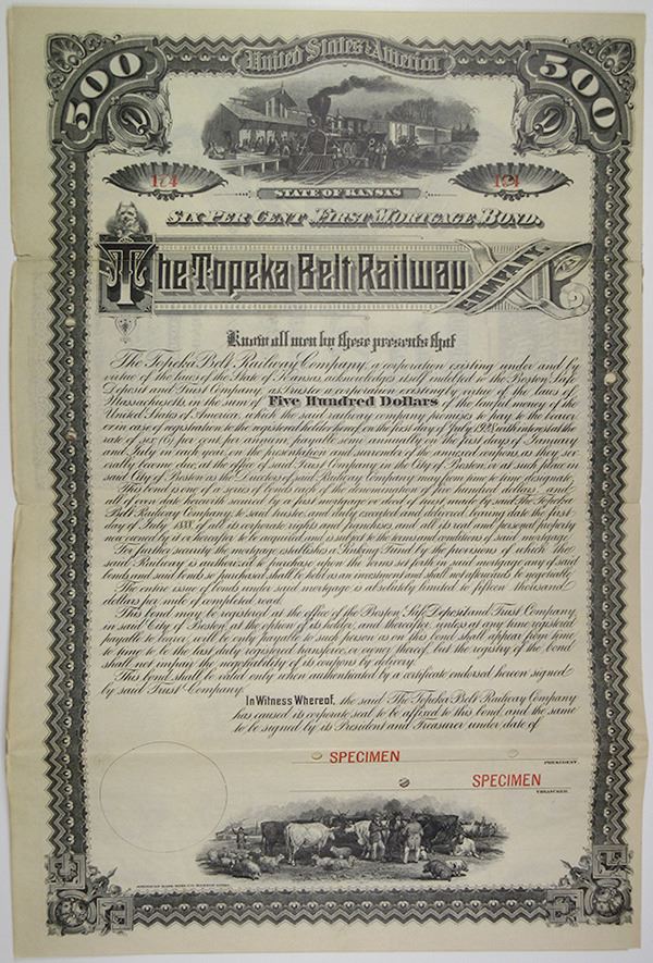 Kansas. $500 Specimen 6% First Mortgage Coupon Bond, Black text with black border, no undertint, with scene of a train arriving at busy platform at top. Red specimen overprints and POC's, Fine condition with archival repairs made along horizontal splits, Printed by ABNC. Only exists as a specimen in Cox.