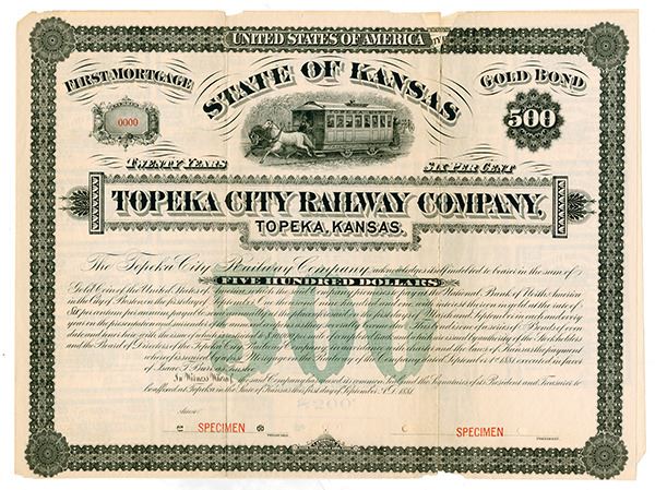 Kansas, 1881, $500 1st Mortgage 6% Specimen Gold Bond, Black printing with ornate border, Horse drawn trolley top center one of the finest trolley vignettes out there, Fine condition with pieces missing and some splitting, ABNC. Unlisted railroad in Cox. Only 1 found.