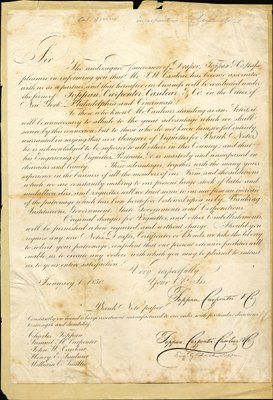 1850. Proof of introductory and advertising letter informing clients of the addition of John W.Casilear to the firm in 1850 and the change of the name of the firm to "Toppan, Carpenter, Casilear & Co." from Toppan, Carpenter & Co.. Letter describes qualifications of Casilear and information about the firm. Bottom has written below Fancy signature of the company's new name "Eng' by Charles Toppan. Rare historic transition letter of addition of famous engraver to famous firm. Unique in archive. TCC&C.