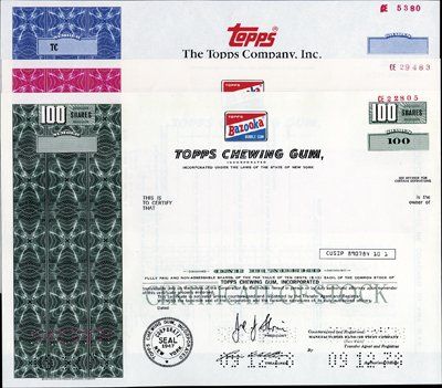 ca.1970's-80's. 100; Odd Shs. 3 different specimen stocks. 2 are Topps Chewing Gum, Inc. and have "Bazooka" bubble gum package logo that individual pieces of gum are packed in. Also "Topps" logo on the 3rd certificate known for sports and basebakk cards. Rare and popular sports, baseball card and gum stock certificates. SCBNC.